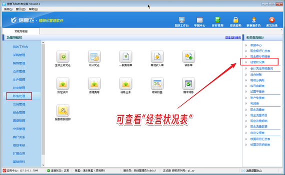 有信管飛RMS專業版用戶升級新版本后,在財務處理模塊無法查看經營狀況表,如下圖所示。 演示視頻觀看鏈接:信管飛RMS專業版如何設置顯示經營狀況表演示視頻 出現以上問題的原因是:新版本默認經營狀況表隱藏顯示。 解決方法如下:使用系統管理員賬號登錄軟件,在功能導航窗點擊“系統管理”—》“系統參數配置”—》“業務參數”打開業務參數界面,在會計憑證相關參數內勾選啟用參數“財務處理相關統計顯示經營狀況表”,然后保存參數配置,如下圖所示。