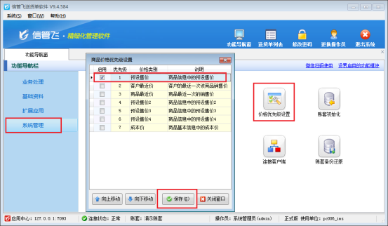 信管飛軟件支持維護客戶銷售價格,可以對不同客戶的商品價格進行集中管理。并且支持設置銷售價格的優先級,比如:客戶最近價、預設售價等。有部分用戶使用時修改了商品價格開單時選擇商品沒有獲取修改后的最新價格,該如何解決? 出現此問題原因:系統管理界面價格優先級,第1級價格設置的是客戶最近價;用戶修改的是商品信息界面商品預設售價。 解決方法:把銷售價格優先級設置為商品預設售價。 操作步驟:系統管理--