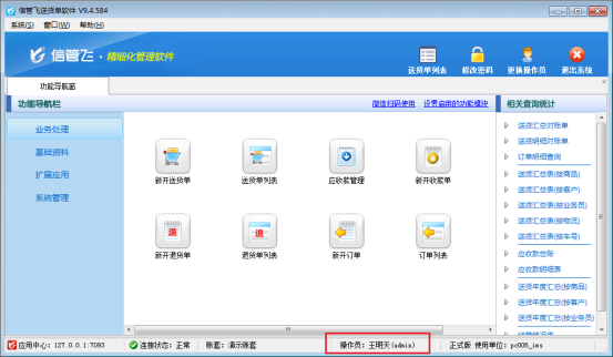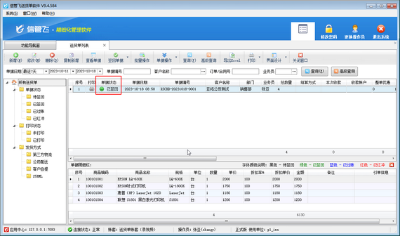 演示視頻觀看鏈接:操作員沒有簽回單據的權限,如何解決演示視頻 送貨單一般情況下是一式三聯(存根聯、客戶聯、回單聯),其中回單聯的作用是:在購買方收到商品核對完畢,與送貨單上的商品明細相符后,在回單聯上簽完名,由銷售方拿回,證明貨物已送達,買方確認已簽收。 信管飛送貨單軟件通過狀態控制實現簡單的流程管理(待簽回—》已簽回—》已結賬),有用戶在簽回單據時無法簽回,系統彈出提示信息“您沒有簽回單據的權限,請與系統管理員聯系!”,如下圖所示。 出現此問題的原