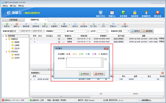 信管飛RMS支持對銷售單列表、采購單列表、銷售訂單列表以及采購訂單列表等標記備注,有用戶在標記單據備注時無法標記,系統彈出提示信息“您沒有標記備注的權限,請與系統管理員聯系!”如下圖所示: 演示視頻觀看鏈接:操作員不可標記單據備注,如何解決演示視頻 出現此問題的原因是:當前登錄的操作員賬號沒有標記單據備注權限,解決方法如下:使用系統管理員賬號登錄軟件,在功能導航窗點擊“系統管理”—》“操作員及授權”打開操作員管理及授權界面,選擇操作員賬號,在“其他操作權限”界面將“標記單據備注”權限勾