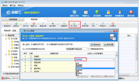 信管飛軟件支持通過Excel導入數據,通過Excel數據導入可以將數據方便快捷的導入到軟件中,省去了使用初期大量的數據的錄入所要消耗的時間及人力物力,并避免人為錄入的誤差,使數據錄入的簡單、準確、高效。下面我們以信管飛RMS軟件為例,示范下導入商品信息后,商品類別沒導入成功,如何解決? 方式一:刪除已導入商品,重新導入,數據項商品類別需要對應EXCEL中商品類別數據列,如圖所示: 方式二:已導入大量商品信息不想刪除,可以進行批量修改商品類別。&nbs