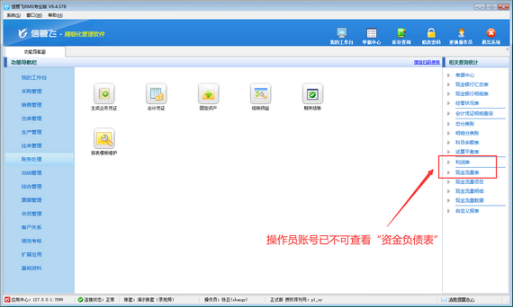 演示視頻觀看鏈接:信管飛RMS如何設置操作員不可查看資產負債表演示視頻 財務報表是財務報告的主要部分,是反映企業或預算單位一定時期資金、利潤狀況的會計報表。信管飛RMS專業版支持財務處理功能,可登記會計憑證,并支持生成財務報表,如資產負債表、利潤表、現金流量表等,如下圖所示。如果不希望員工賬號登錄后查看到這些報表,如何設置呢?本篇文章演示一下如何設置操作員不可查看資金負債表? 登錄軟件,在功能導航窗點擊“系統管理”—》“操作員及授權”,進入“操作員管理及授權”界面,選擇操作員“張亞”,在其右側的功