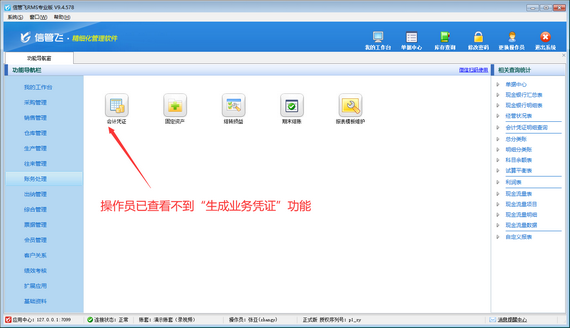 演示視頻觀看鏈接:信管飛RMS如何設置操作員不可生成業務憑證演示視頻 信管飛RMS專業版包含財務處理功能,可登記會計憑證,支持直接對已開單據進行快速生成會計憑證操作,如下圖所示。為避免操作員誤生成會計憑證,軟件支持設置操作員權限,本篇文章介紹下如何設置操作員不可使用生成業務憑證功能? 登錄軟件,在功能導航窗點擊“系統管理”—》“操作員及授權”,進入“操作員管理及授權”界面,選擇操作員“張亞”,在其右側的功能模塊權限內選擇“財務處理”,將生成業務憑證的“使用”權限勾選取消,然