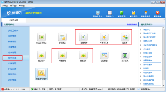 此文章相關演示視頻:專業版軟件如何顯示財務處理輔助單據演示視頻 信管飛RMS專業版軟件支持使用財務處理功能,部分用戶在使用最新版本軟件時,會發現財務處理功能沒有一般費用單、其他收入單、調賬業務等功能,這是因為未勾選“顯示財務處理輔助單據”參數導致的,本文以“RMS專業版”為例介紹下如何顯示財務處理輔助單據? 功能導航欄點擊“財務處理”,此時財務處理輔助單據未顯示。如圖所示: 功能導航欄點擊“系統管理”-