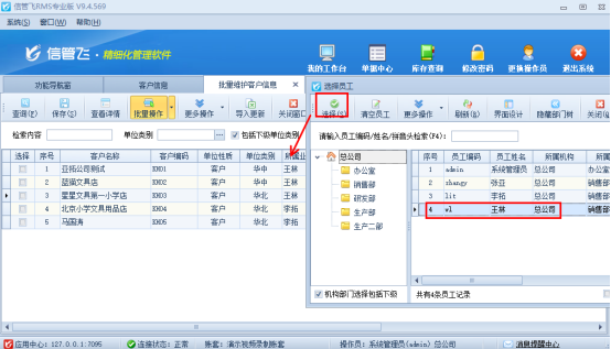 演示視頻觀看鏈接:業務員離職,所屬客戶如何轉給其他業務員? 信管飛軟件客戶和供應商都支持設置所屬業務員,針對員工離職,所屬客戶如何轉給其他業務員,軟件中可以這樣操作,本文以“信管飛RMS軟件”為例,示范下如何批量更改客戶所屬業務員為其他員工。 在功能導航窗選擇基礎資料,打開客戶信息界面,工具欄更多操作下打開“批量維護客戶信息”界面。如下圖所示: 在批量維護客戶信息界面,點擊“批量操作”進入批量模式,選擇