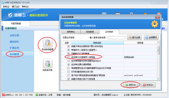 演示視頻觀看鏈接:輸入商品簡稱如何自動獲取商品信息 信管飛送貨單軟件使用前先維護好基礎資料中商品信息內容,新開單據選擇客戶后,點擊“添加明細”可彈出選擇商品界面,可選擇添加好的商品信息,或者開送貨單直接添加新商品兩種方式,有客戶操作習慣輸入商品信息名稱拼音簡寫自動獲取商品信息,本節介紹下輸入商品簡稱如何自動獲取商品信息。 在功能導航欄系統管理----系統參數配置----業務參數配置中,取消勾選參數“送貨單允許直接錄入新商品”,點擊保存,如圖所示:&n