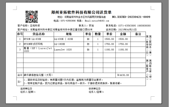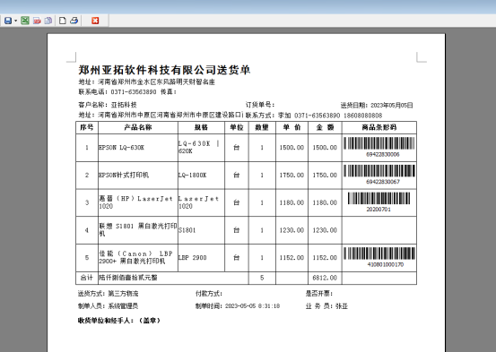 此文章相關演示視頻:打印模板如何刪除明細列演示視頻 信管飛系列軟件下的信管飛RMS軟件、信管飛送貨單軟件、信管飛倉庫管理軟件等都支持自定義設計打印模板格式,開單界面上自定義數據項,打印預覽界面不需要顯示此數據,此時需要修改打印格式模板,刪除一列明細。以信管飛送貨單軟件為例,示范下如何在打印模板中刪除明細列? 新開一個送貨單,打印模板預覽圖如下: 如何在打印模板上刪除顏色數據列?打印模板格式因為尺寸固定,