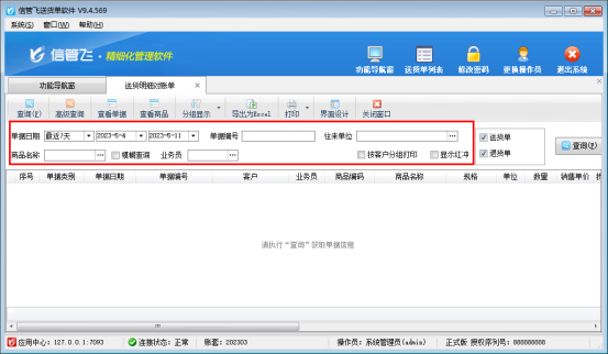 信管飛RMS軟件、信管飛倉庫管理軟件、信管飛送貨單軟件等都支持開銷售單,已開單據支持匯總統計。軟件根據錄入的單據,可以自動生成統計報表,后期查詢對賬可做到一目了然。針對客戶咨詢如何導出某客戶一段時間的所有銷售商品明細,本文示范下不同軟件在哪進行查詢匯總? 信管飛RMS軟件,功能導航窗點擊“銷售管理”,在銷售管理模塊右側查詢統計下點擊“銷售單明細查詢”,可查詢所有已開銷售單的商品明細內容。如下圖所示: 查詢支持按單據日期、客戶名稱、商品名稱、倉庫等條件