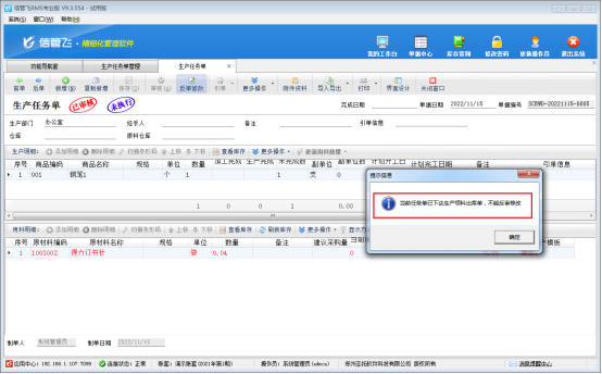 生產任務單,即生產過程中的任務加工單,用于執行生產計劃,進入實際生產階段。生產領料單,即生產過程中可通過開生產領料出庫單領取原材料出庫。軟件內生產領料出庫單支持引用生產任務單進行領料出庫,部分用戶在生產領料單引單生產任務單但領料單未審核的情況下,反審生產任務單,會出現生產任務單無法進行反審修改,提示“當前任務單已下達生產領料出庫單,不能反審修改”的情況,如圖所示: 存在此提示信息是因為業務參數設置中未勾選參數“可修改已被引用的單據”影響,解決方法如下:在功能導航窗點擊“系統管理”—》“系統參數配置