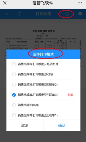 信管飛軟件支持PC端和手機微信端使用,用戶使用手機微信端可以開單和查詢操作,有用戶需要手機開單后直接發送打印預覽界面給客戶,手機微信端支持開單界面打印預覽,可在打印預覽界面保存預覽圖分享給客戶,本文示范下如何操作? 手機微信端登錄可查看此文章:信管飛軟件微信端如何使用? 微信端登錄后,新增銷售出庫單并保存,點擊右上角的豎三點符號,可彈出打印預覽操作界面。如下圖所示: 點擊“打印預覽”可顯示默認模板的打印