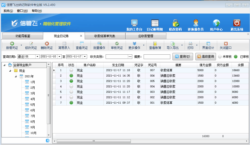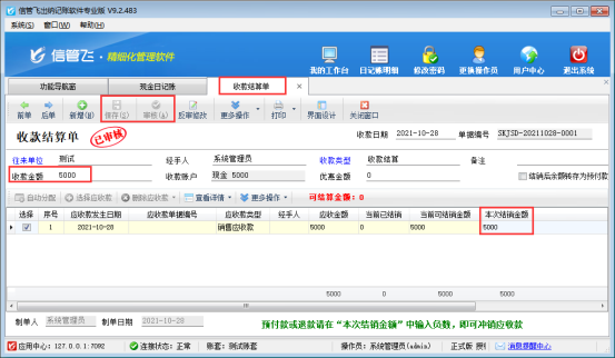 信管飛出納記賬軟件是集出納日記賬、應(yīng)收應(yīng)付款管理、發(fā)票管理為一體的軟件,軟件支持登記客戶的應(yīng)收應(yīng)付款時(shí)直接轉(zhuǎn)記出納憑證,后期實(shí)際收款支持在出納日記賬界面進(jìn)行核銷(xiāo)結(jié)算。本文以應(yīng)收款管理的結(jié)算進(jìn)行示范。 功能導(dǎo)航窗“往來(lái)管理”—》“應(yīng)收款管理”中,新增一筆客戶“測(cè)試”的應(yīng)收款記錄,應(yīng)收金額5000元,保存并轉(zhuǎn)記現(xiàn)金憑證,如下圖所示: 日記賬轉(zhuǎn)記完成后,可在功能導(dǎo)航窗“出納管理”—》“現(xiàn)金日記賬”中查看到憑證號(hào)為001的憑證記錄。后期客戶實(shí)際付款需要對(duì)此筆