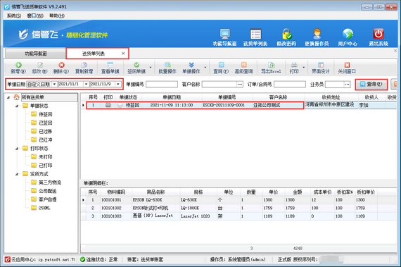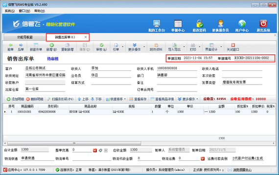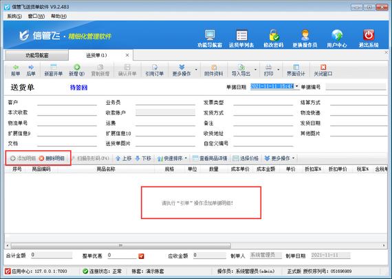 信管飛RMS軟件、信管飛送貨單軟件、信管飛倉(cāng)庫(kù)管理軟件開(kāi)單界面單據(jù)保存后默認(rèn)單據(jù)日期和單據(jù)編號(hào)是當(dāng)天的。有些客戶需要提前開(kāi)單,第二天直接出庫(kù),這種情況該如何處理呢?軟件支持提前錄入單據(jù)。下面以信管飛送貨單軟件為例,演示下如何提前開(kāi)單? 在功能導(dǎo)航窗點(diǎn)擊“業(yè)務(wù)處理”—》“新開(kāi)送貨單”打開(kāi)送貨單,錄入單據(jù)信息。如下圖所示: 送貨單界面,修改單據(jù)日期為2021年11月9日,錄入單據(jù)主體和單據(jù)明細(xì)信息,點(diǎn)擊保存按鈕后,會(huì)彈出提示“當(dāng)前輸入的單據(jù)日期【2021-11-09】大于當(dāng)前系統(tǒng)日期【202