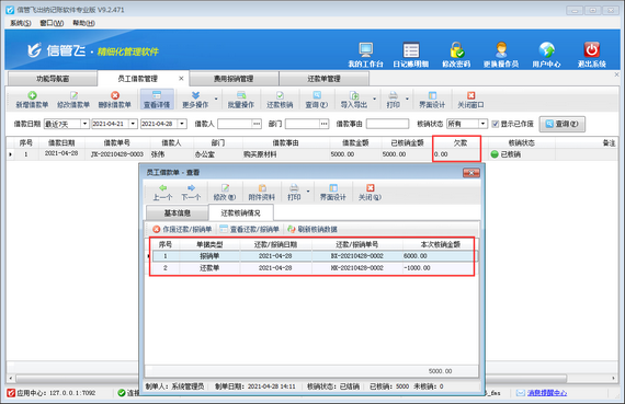 出納記賬軟件專業版的員工借款管理及還款管理功能可以對企業員工借款、還款進行流程化登記管理,提高 了企業管理效率。本篇文章介紹一下出納記賬軟件報銷金額大于借款金額,需要給員工退款的情況下,軟件內如何處理? 如下圖所示,員工“張偉”借款金額為5000元,費用報銷了6000元,報銷金額大于借款金額,導致欠款-1000元,需退還給員工。這種情況下,需做還款單,進行還款處理,將欠款金額清零。 在功能導航窗,點擊“綜合管理”—》“還款單管理”打開還款單管理界面,新增還款單,選擇還款人,