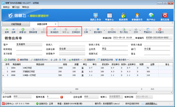 信管飛RMS是進銷存一體化的軟件,支持管理往來應收應付款,銷售出庫單審核后自動生成銷售應收款信息,可以對銷售應收款進行收款結算,如銷售應收款已結銷的情況下,發現銷售出庫單有填開錯誤,需要修改,系統默認是不能直接進行反審修改操作,如下圖所示。 如出現以上情況,可以先將銷售出庫單相關的結銷記錄紅沖(或刪除)后,然后在修改銷售出庫單,本文介紹一下具體操作步驟。 打開銷售出庫單界面,然后在工具欄點擊“更多操作”—》“查看應收款及結銷情況”,彈出應收應付及結銷情況窗口,在此窗口點擊“查看結算單”