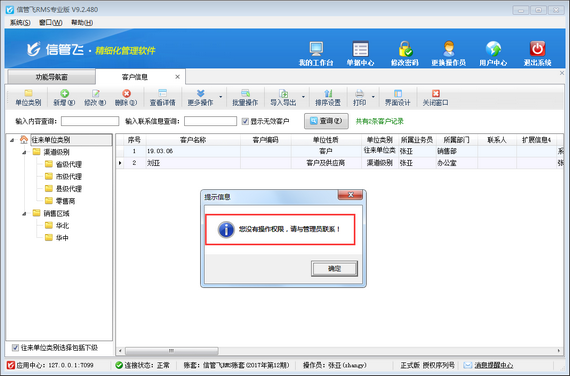 信管飛RMS(進銷存管理軟件)中支持設置往來單位應收應付信用額度,客戶在信用額度內可先收貨后付款,對于超過信用額度的客戶,系統支持鎖定功能,已被系統鎖定的客戶,不允許繼續開單,付款后可進行解鎖。另外,軟件也支持設置操作員不可鎖定解鎖往來單位,本文介紹一下進銷存管理軟件如何設置操作員不可鎖定解鎖往來單位權限? 在功能導航窗點“系統管理”—》“操作員及授權”即可進入“操作員管理及授權”界面,選中操作員賬號,在“其他操作權限”界面將“可鎖定解鎖往來單位(客戶、供應商、物流快遞)”權限打鉤取消,然后保存權限設置,如下圖所示,設置