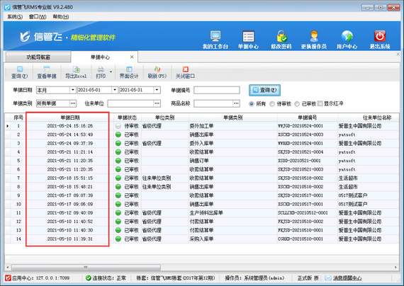信管飛RMS是集采購管理、銷售管理、庫存管理、往來應收應付款等一體化的進銷存管理軟件,軟件支持單據中心功能,在單據中心內可以查詢到軟件內所填開的所有業務單據,可以根據單據日期、單據編號、單據類別、往來單位、商品名稱、審核狀態等信息查詢所需單據,查詢結果默認是根據單據日期正序顯示,如下圖所示。 如需設置單據中心按單據日期倒敘顯示,優先顯示最新日期的單據,也可以在系統參數配置中啟用參數“單據中心按單據日期倒敘顯示”,如下圖所示,在功能導航窗點擊“系統管理”—》“系統參數配置”—》“業務參數”打開業務參數配置界面,將查詢統計參