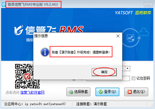 為了方便用戶隨時隨地使用軟件,亞拓軟件推出云賬套模式。云模式是亞拓軟件推出的一種在線應用模式,軟件數據存儲在云端,可以隨時隨地使用軟件,信管飛所有軟件都支持云賬套模式。    有些用戶登錄云賬套時,系統提示“客戶端與云應用中心要求的版本號不一致,請升級更新后再登錄!”如下圖1所示,登錄時之所以會提示升級版本,是因為亞拓軟件自主研發的軟件是不斷升級優化的,發布新版本后,云賬套模式的客戶端需要和云應用中心的版本一致才可以登錄,下面我們以信管飛RMS專業版為例,介紹下如何升級到最新版本軟件?圖1