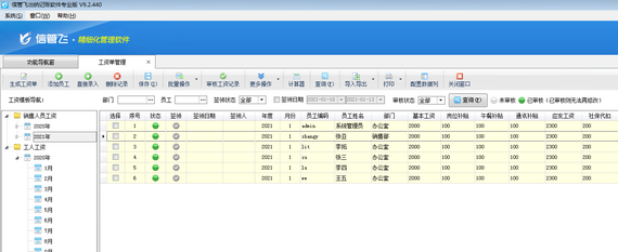 信管飛出納記賬軟件專業版包括工資管理功能,支持自定義工資模板,可根據設置的工資模板快速生成工資單,支持從上月工資單復制工資項目數據,工資項目數據錄入完成核對無誤后審核生效,審核后不再支持直接修改。如果工資記錄較多,逐條審核工資記錄會比較耗時,軟件支持批量審核工資記錄,可節省時間提高工作效率。本篇文章介紹一下出納記賬軟件中如何批量審核工資記錄?    在功能導航窗點擊“綜合管理”—》“工資單管理”,打開工資單管理界面,在工資記錄列表中打鉤選擇要審核的工資記錄(工具欄點擊“批量操作”支持全選),然后點擊“審核工資記錄”,系統彈出提