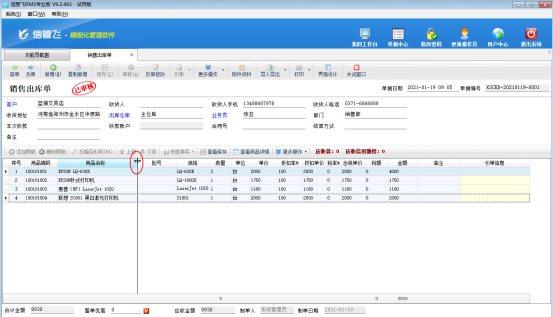 信管飛RMS、信管飛倉庫管理軟件、信管飛送貨單軟件、信管飛出納記賬軟件都可根據用戶自身業務特點進行自定義單據內容的顯示寬度,以滿足更多用戶的需求。下面我們以信管飛RMS專業版的銷售出庫單為例介紹一下單據內容顯示寬度的設置方法。方法一:通過界面設計調整單據內容的顯示寬度    登錄軟件,在功能導航窗點“銷售管理”—》“銷售出庫單”即可進入“銷售出庫單”界面,以單據明細的“商品名稱”為例,系統默認的“商品名稱”顯示寬度,如下圖1所示。圖1    在銷售出庫單界面點擊“界面設計”按鈕,系統彈出界面設計窗