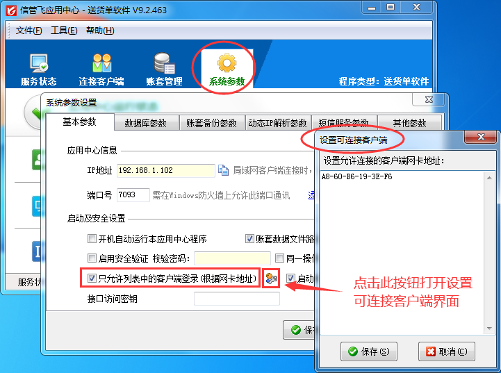 部分信管飛軟件用戶在登錄軟件時會出現軟件登錄不成功的情況,如下圖所示,系統彈出提示信息:應用中心不允許此客戶端連接!    如出現以上問題,可根據下面的解決方法進行解決:    信管飛系列軟件在軟件應用中心中支持設置可連接的客戶端電腦(根據網卡地址判斷),如下圖所示,勾選“只允許列表中的客戶端登錄(根據網卡地址)”參數,然后設置允許連接的客戶端網卡地址即可,每行一個網卡地址。    如出現“應用中心不允許此客戶端連接!”的提示信息,是因為這臺電腦并不是設置的可允許連接