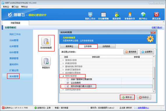 信管飛出納記賬軟件新增或者修改日記賬憑證時,支持添加文檔、圖表等附件資料,可掃描或導入與日記賬憑證相關的電子文件,方便用戶更全面、直接地查詢日記賬發生的全過程,有利于企業對內部流水賬的管理(如下圖所示),附加資料窗口默認顯示模式支持大窗口和小窗口兩種顯示模式,本文介紹一下如何設置附件資料窗口默認顯示模式?    在功能導航窗點擊“系統管理”—》“系統參數配置”—》“業務參數”打開業務參數配置界面,然后在特殊功能參數中可以找到“附件資料窗口最大化顯示”參數,如下圖所示。    “附件資料窗口最大化顯