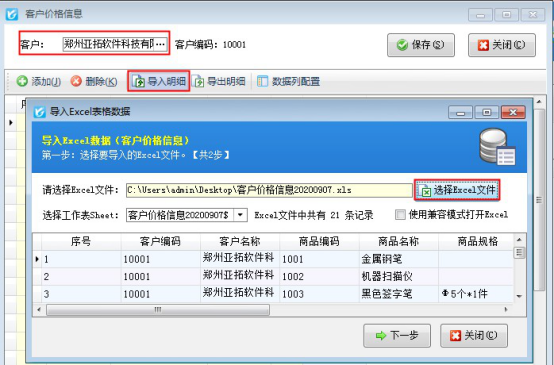 信管飛送貨單軟件、信管飛RMS軟件等支持按客戶管理商品價格信息,前期使用軟件沒有客戶最近商品價格,軟件支持通過導入導出方式,可把整理好的商品價格信息批量導入軟件中,本文以“信管飛送貨單軟件”為例,示范下如何批量導入客戶價格信息?     在功能導航窗點擊“基礎資料”—》“客戶價格信息”,進入客戶價格信息界面,點擊“新增”按鈕下的“按客戶添加價格信息”如下圖所示:     點擊“按客戶添加價格信息”,彈出客戶價格信息界面。先選擇客戶信息,然后可以通過“導入明細”,導入