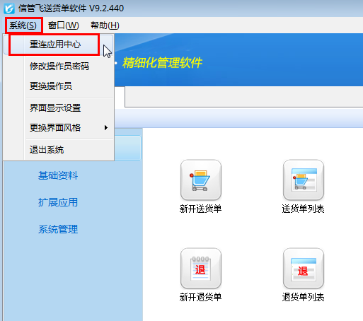 信管飛RMS、信管飛倉庫管理軟件、信管飛票據打印軟件、信管飛出納記賬軟件、信管飛送貨單軟件都包括客戶端程序和應用中心程序兩個模塊,客戶端程序登錄系統時,應用中心程序是必須打開的。如果主機電腦關機或關閉應用中心程序、程序出現異常等,客戶端程序與應用中心的連接就會斷開。應用中心程序再次正常運行后,客戶端程序需要重新建立與應用中心程序的連接。下面我們以信管飛送貨單軟件為例介紹一下客戶端程序重連應用中心程序的操作方法。 客戶端程序與應用中心程序斷開時,軟件界面最下方的“連接狀態”會顯示“已斷開”,如圖1所示。圖 1 &