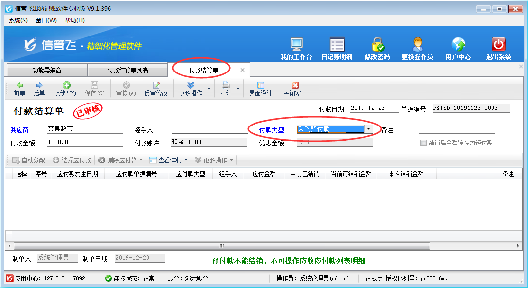 采購預付款是我們提前預付給供應商的金額,可以用來沖銷采購產生的應付款,本文以信管飛出納記賬軟件專業版為例演示一下如何使用采購預付款沖銷采購應付款? 在功能導航窗點擊“往來管理”—》“應付款管理”打開應付款管理界面,如下圖所示,在應付款管理內對同一個供應商分別新增一條應付款記錄,一條預付款記錄,結銷狀態為“未結銷”狀態,已結銷金額為0。 在應付款管理界面工具欄有“付款結算”按鈕,可以打開付款結算單對采購應付款/預付款進行付款結銷。如下圖所示,供應商“文具超市”應付金額1000元,采購預付