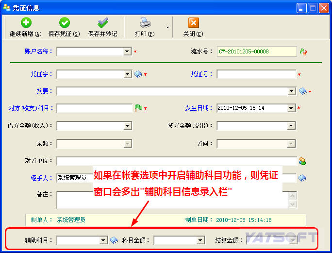 (2)如果不啟用輔助科目,也可以填寫兩個憑單。比如上面的例子,可以先錄入一個3000元的借方,然后在錄入一個20元的貸方。
