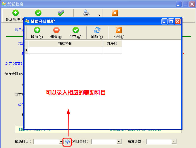 輔助科目可錄入也可以在下拉列表框中選擇,可在主窗口菜單“基礎資料”——》“輔助科目維護”中維護,也可以點擊憑證窗口,輔助科目數(shù)據項旁邊的小按鈕設置。如下圖所示: