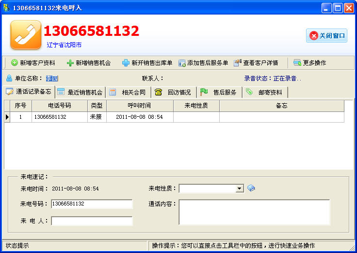 紅管家系列軟件(紅管家售后服務(wù)管理軟件、紅管家送貨單軟件)支持來電彈屏功能,客戶來電可以彈出窗口顯示客戶的詳細資料以及銷售情況,極大的提供了客戶來電接待的滿意度。來電彈屏窗口如下圖所示: