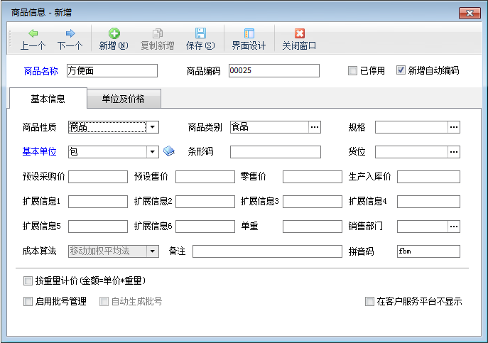 點(diǎn)擊“單位及價格”,進(jìn)入單位及價格界面,添加輔助單位,設(shè)置基本單位與輔助單位之間的換算關(guān)系,如商品“方便面”的基本單位“包”與輔助單位“箱”之間的換算關(guān)系為一箱等于24包,如下圖二所示。