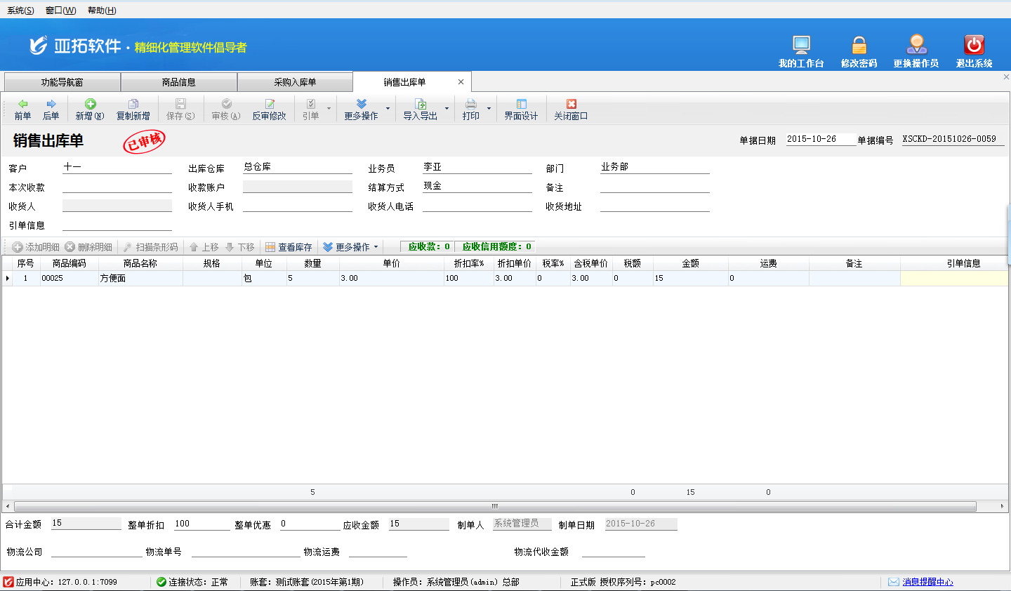 三、新增銷售出庫單,銷售商品“方便面”五包,如下圖四所示。
