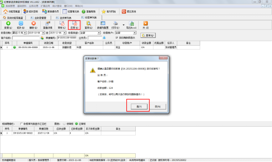 如果相應的收款單已經審核過了,此時刪除時,系統會提示“當前收款單已審核,不允許進行刪除操作!(如確需刪除請先反審)”,如下圖五所示。
