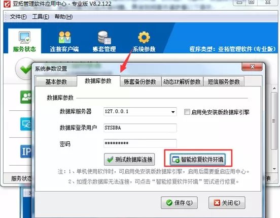 2、點擊“系統(tǒng)參數(shù)”,在“數(shù)據(jù)庫參數(shù)”頁點擊“智能修改軟件環(huán)境”。(也可點擊菜單“幫助----智能修復(fù)軟件環(huán)境”)