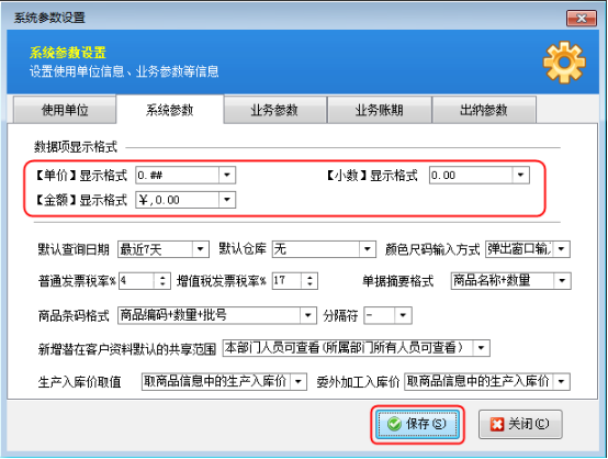 在系統參數中對“單價”、“小數”(數量)、“金額”選擇相應的顯示格式后點擊“保存”按鈕即可,在軟件中這些數據項的顯示格式會改變。如圖3所示設置后,在圖4的銷售出庫單可看到相應的數據項的顯示格式。
