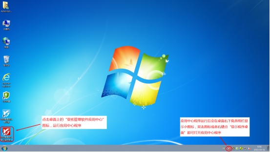 主機(jī)電腦開(kāi)機(jī)且運(yùn)行“亞拓管理軟件應(yīng)用中心”程序;點(diǎn)擊桌面上的“亞拓管理軟件應(yīng)用中心”程序圖標(biāo)(或者在開(kāi)始菜單中點(diǎn)擊程序組中的相應(yīng)功能),即可打開(kāi)運(yùn)行應(yīng)用中心程序。應(yīng)用中心程序運(yùn)行后會(huì)在桌面右下角顯示應(yīng)用中心圖標(biāo):
