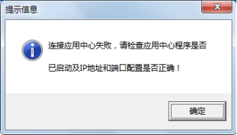 在登錄窗口,點(diǎn)“登錄”按鈕,即可登錄軟件。如果主機(jī)電腦沒(méi)有運(yùn)行應(yīng)用中心程序或者主機(jī)電腦的IP地址變了,軟件會(huì)彈出如下提示信息: