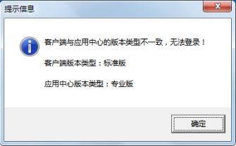 ③如果登錄的時(shí)候提示如下信息,則表明客戶(hù)端程序的版本類(lèi)型與主機(jī)電腦上的應(yīng)用中心程序的版本類(lèi)型不一致,請(qǐng)使用相同版本類(lèi)型的程序登錄即可。