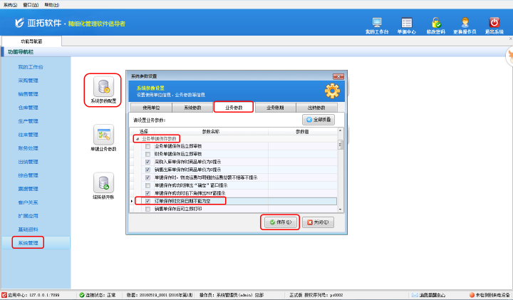 亞拓管理軟件紅管家倉庫管理軟件紅管家送貨單軟件等都可以設(shè)置訂單保存時(shí)交貨日期不能為空,本篇文章以亞拓管理軟件專業(yè)版為例介紹一下如何設(shè)置訂單保存時(shí)交貨日期不能為空,通過“系統(tǒng)管理”——》“系統(tǒng)參數(shù)配置”——》“業(yè)務(wù)參數(shù)”可以進(jìn)入“業(yè)務(wù)參數(shù)”配置界面,在業(yè)務(wù)單據(jù)保存參數(shù)內(nèi)打勾啟用“訂單保存時(shí)交貨日期不能為空”參數(shù),如下圖一所示。