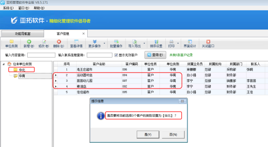 以圖1為例,客戶單位類別是“華南”的一共有5條記錄,現在要把第2條至第4條這3條記錄的單位類別改為“華北”。首先點擊第2條記錄,然后按下Shift鍵不松手時鼠標點擊第4條記錄,這樣就可以同時快速選中第2條至第4條這3條記錄,選中多條記錄后,再按住鼠標左鍵不松手,移動到單位類別“華北”處,此時系統會提示“是否要將當前選擇3個客戶的類別設置為【華北】?”,點擊“是”按鈕即可,如圖2所示。