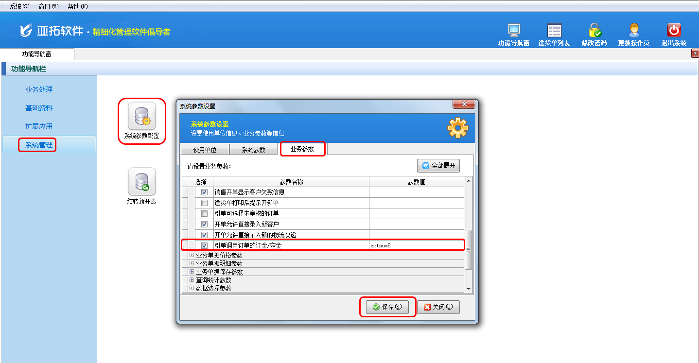 在功能導(dǎo)航窗點(diǎn)擊“系統(tǒng)管理”——》“系統(tǒng)參數(shù)設(shè)置”——》“業(yè)務(wù)參數(shù)”可以進(jìn)入到“業(yè)務(wù)參數(shù)”配置界面,在業(yè)務(wù)單據(jù)相關(guān)參數(shù)內(nèi)打勾啟用“引單調(diào)用訂單的定金/訂金”參數(shù),并設(shè)置參數(shù)值(擴(kuò)展數(shù)值字段名),默認(rèn)為“extnum8(擴(kuò)展數(shù)值8)”,如下圖一所示。