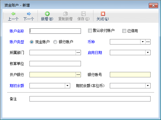 新增:點擊工具欄中的“新增”按鈕,系統彈出“新增資金賬戶”窗口(如下圖所示),選擇賬戶類型,錄入資金賬戶的相關信息后點擊“保存”按鈕即可。