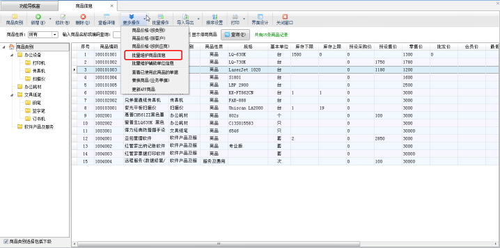 在功能導(dǎo)航窗點(diǎn)擊“基礎(chǔ)資料”—》“商品信息”打開(kāi)商品信息主界面,在工具欄點(diǎn)擊“更多操作”—》“批量維護(hù)商品信息”可以打開(kāi)批量維護(hù)商品信息界面,如下圖一所示。