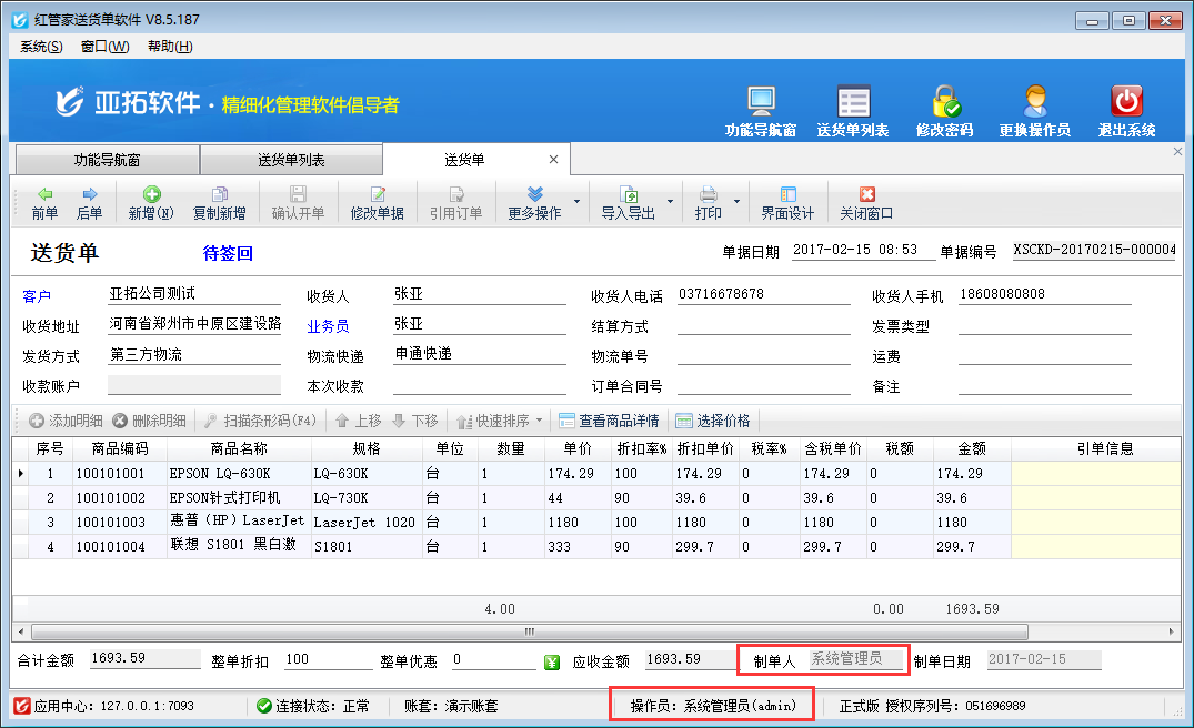亞拓管理軟件、紅管家送貨單軟件、紅管家倉庫管理軟件、紅管家出納記賬軟件、紅管家票據打印軟件等安裝后默認登陸的操作員為“系統管理員”,開單時“制單人”數據為當前操作員名稱(即“系統管理員”),部分用戶在使用軟件時需要將其修改為其他名稱,在軟件內如何修改呢?本篇文章以紅管家送貨單軟件為例詳細介紹一下如何修改“制單人”名稱?