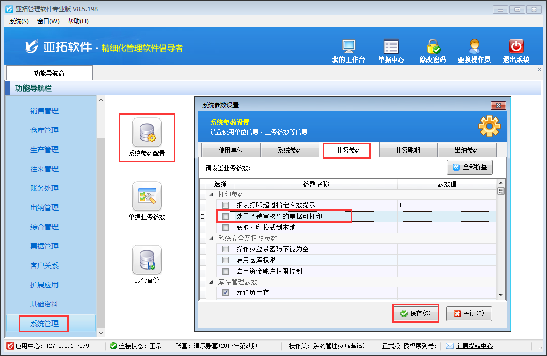 在功能導航窗點擊“系統管理”—》“系統參數配置”—》“業務參數”,即可進入到“業務參數”配置界面,在打印參數內找到“處于‘待審核’的單據可打印”參數,把這個參數的勾選去掉,然后保存,如下圖一所示。