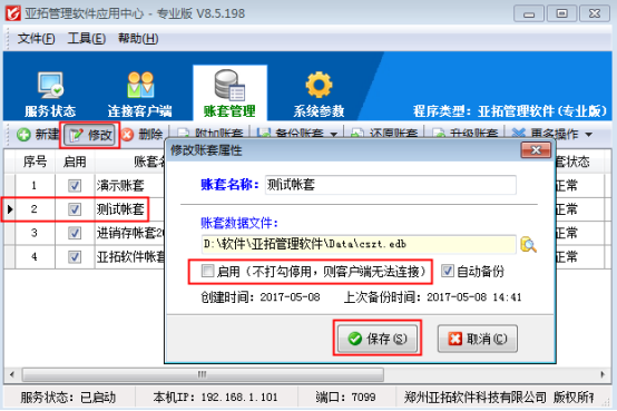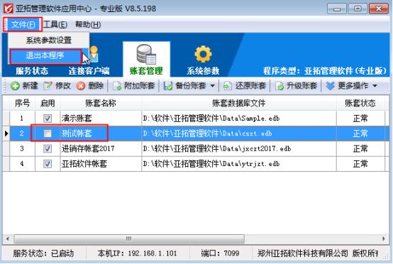 亞拓軟件旗下的亞拓管理軟件、紅管家倉庫管理軟件、紅管家送貨單軟件、紅管家出納記賬軟件、紅管家票據(jù)打印軟件等軟件新架構(gòu)程序安裝后會顯示兩個圖標(biāo),一個是應(yīng)用中心程序(紅色圖標(biāo)),一個是客戶端程序(藍(lán)色圖標(biāo))。這些軟件都含有賬套管理功能,在應(yīng)用中心里面可以建立多個賬套,已使用的帳套如果不再繼續(xù)使用,可以停用帳套,停用帳套后,客戶端程序登錄時無法連接該帳套。我們以亞拓管理軟件專業(yè)版為例演示一下如何停用帳套。