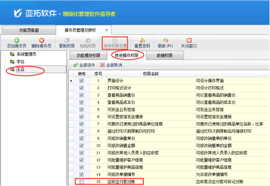 在功能導(dǎo)航窗,點(diǎn)擊“操作員管理及授權(quán)”,進(jìn)入操作員管理及授權(quán)頁面,選擇需要設(shè)置的操作員“王亞”(系統(tǒng)管理員默認(rèn)具有所有權(quán)限,不允許修改),打開“其他操作權(quán)限”,在最后一個權(quán)限“應(yīng)收應(yīng)付款對賬”勾選符號取消,然后保存操作員權(quán)限。如下圖1所示: