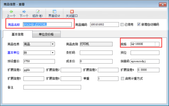 首先我們在“基礎資料”—》“商品信息”中添加一個帶有規格的商品信息,如圖1所示,商品“EPSON針式打印機”的商品規格為“LQ-1800K”。