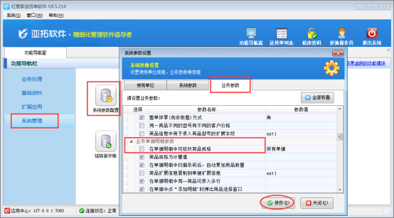 在功能導航窗選擇“系統管理”—》“系統參數配置”—》“業務參數”,在“業務單據明細參數”中把“在單據明細中可修改商品規格”前的勾選符號取消,點擊“保存”按鈕,保存參數設置。如圖2所示: